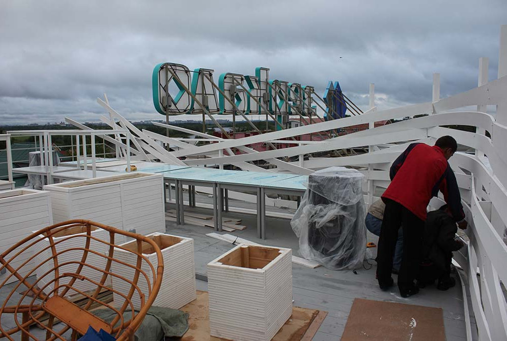 Летняя площадка на крыше торгового центра с видом на весь город.